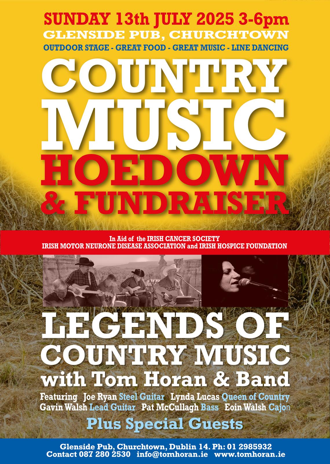 COUNTRY MUSIC HOEDOWN & FUNDRAISER In aid of the Irish Cancer Society, Irish Motor Neurone Disease Association and Irish Hospice Foundation LEGENDS OF COUNTRY MUSIC with Tom Horan & Band Featuring Joe Ryan β Steel Guitarβ Lynda Lucas β Queen of Country Gavin Walsh β Lead Guitarβ Pat McCullagh β Bassβ Eoin Walsh β Cajon […]